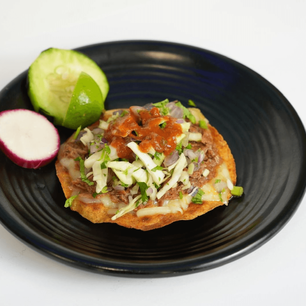 TOSTADA,BEANS,BIRRIA,LETTUCE,ONIONS,SOUR CREAM,AVOCADO,COTIJA CHEESE,CILANTRO & BIRRIA BROTH