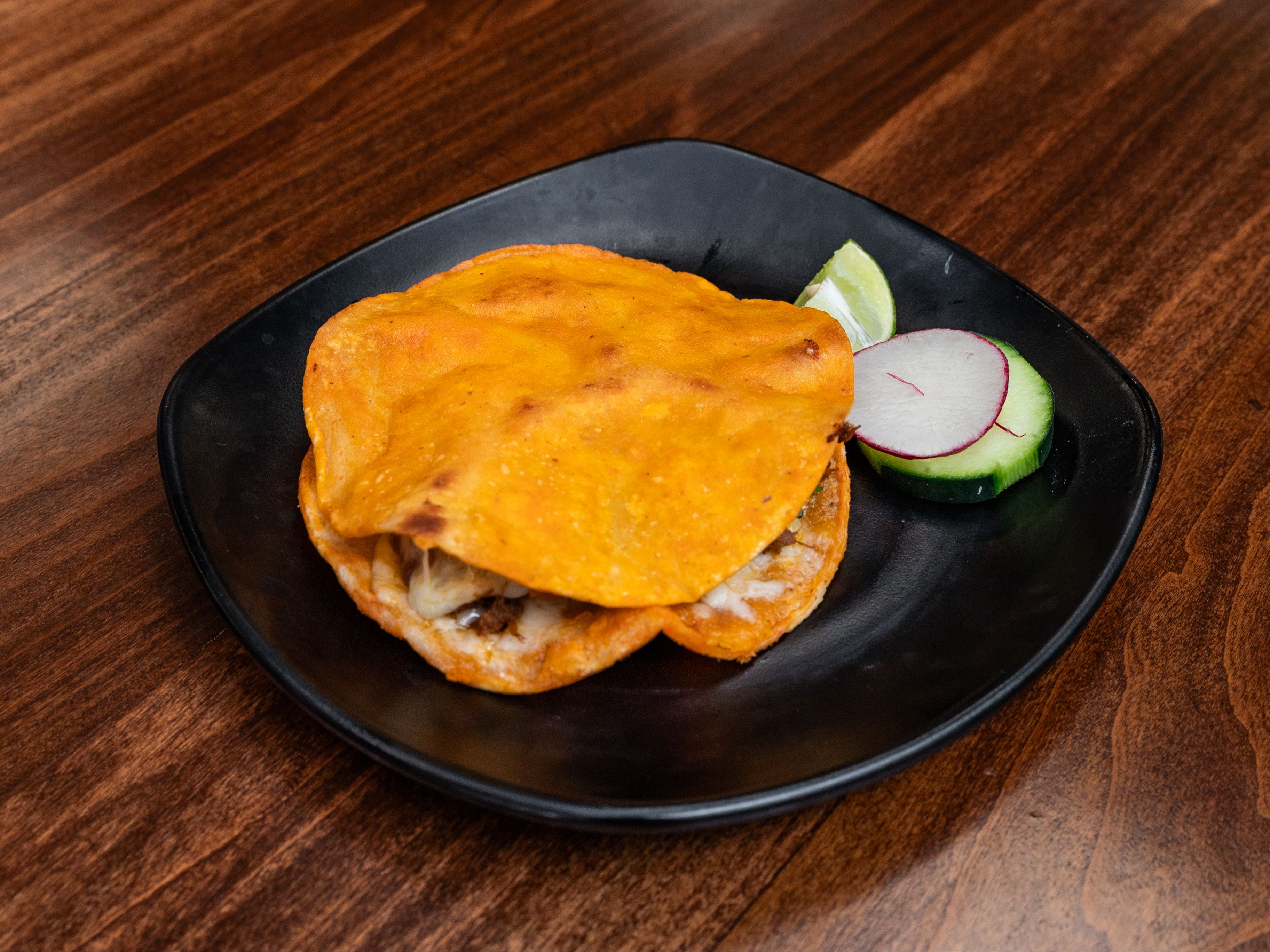 CRISP CORN TORTILLA,W/CHEESE,BIRRIA,MIX AND SALSA